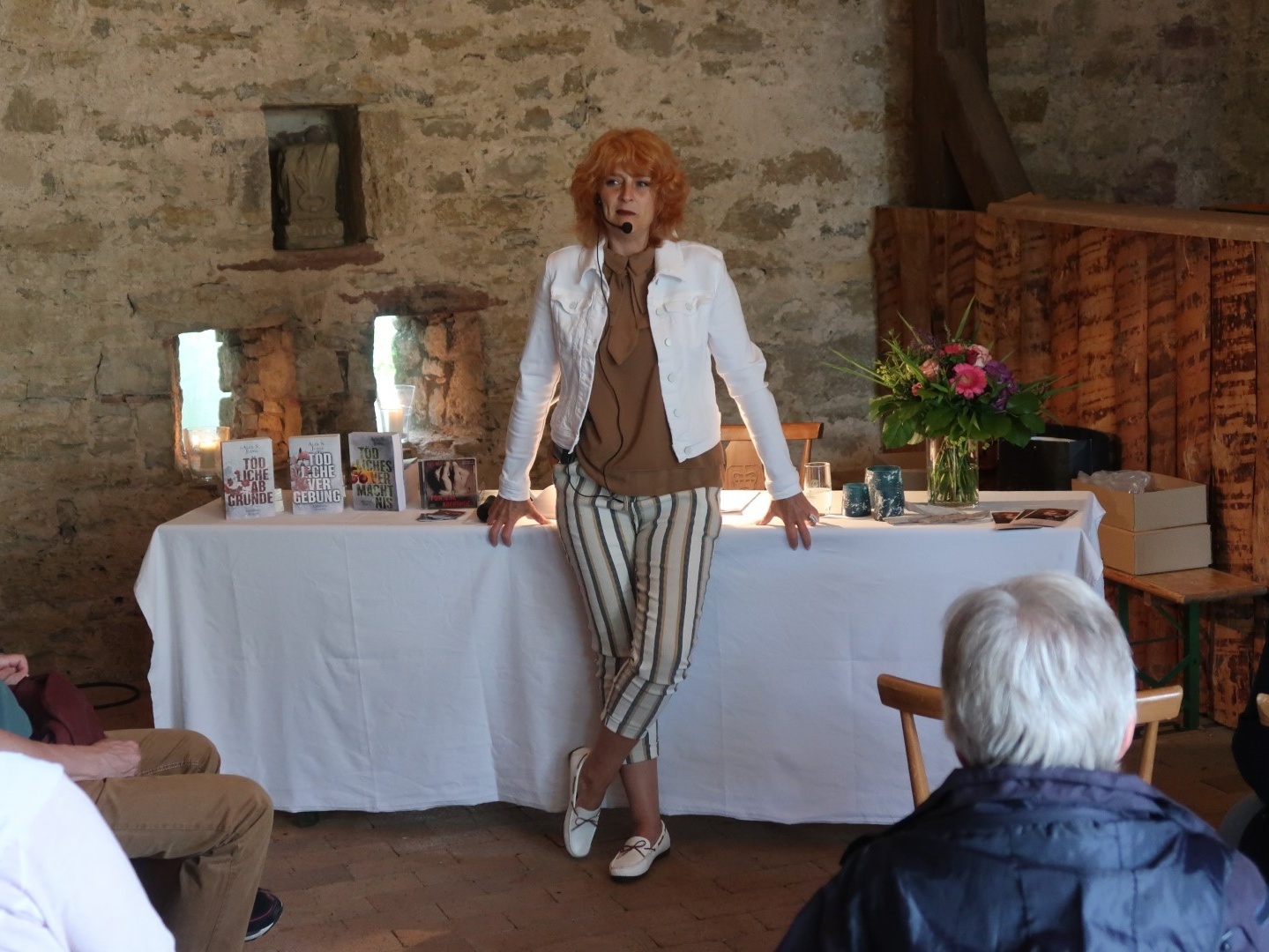 Bevor sich die Autorin an ihren Lesetisch setzte, erzählte sie ein wenig aus ihrem Leben. Dass sie „im Osten aufgewachsen ist“ und heute in Karlstadt lebt, dass sie „immer gern geschrieben“ habe und sich mit ihrer Erstveröffentlichung „Tödliche Abgründe“ im Jahr 2016 lediglich selbst die Frage beantworten wollte, ob sie es wohl schaffen würde, jemals ein Buch zu schreiben.